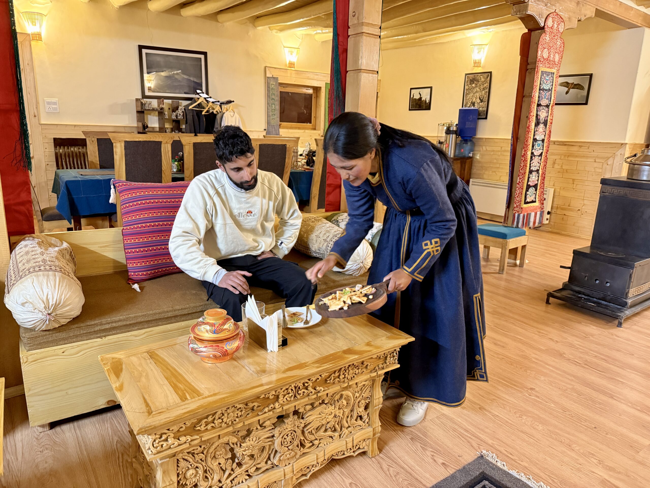 周囲360度を雪山に囲まれた高原に建ち、まさに“野生の中に滞在する”特別な環境が広がります。ロッジはラダックの伝統建築を取り入れながら、床暖房や断熱構造、薪ストーブなどを備え、厳しい自然の中でも快適に過ごせる設計。